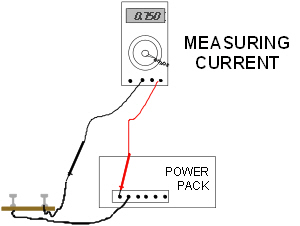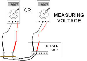 A VOM tutorial - ezdays - 01-19-2009 Jim Currie suggested that I do a tutorial on the use of a VOM meter some time ago. This is essentially copy of that tutorial that was posted elsewhere over two years ago. His thinking is that every modeler needs this tool, and should know how to use it. A VOM meter is indispensable for use during wiring and troubleshooting layouts and accessories. This meter is an electrical device used to measure Volts, Ohms and Milliamps, thus the name, VOM. There are two types of these meters, one is analog where the value of what you’re measuring is shown by the position of a needle on a dial face, and the other has a digital readout. I have an analog meter that is probably a good 50 years old and still works, but finding one is difficult nowadays, so we’ll talk about the digital type. Let’s spend a little time discussing what is it that we’re actually measuring. Volts are the amount of electrical potential between two points, kind of like the amount of water behind a dam, the higher the water, the more potential there is. There is AC volts and DC volts. AC is what you get out of the wall socket in your house and can only be created by a generator. Current flows back and forth 50 or 60 times a second. DC volts are what you get out of a battery or a power pack that has change AC into DC. Current flows only in one direction in this case. There is another tutorial on power packs here that you might want to read. Voltage by itself can do nothing. You can frequently measure voltage between yourself and a water pipe, but it is normally harmless. Notice I said “normally”. If you measure a few volts between you and the pipe, that’s what’s know as “pick-up”, if you measure a lot higher, say 110, don’t touch the pipe, that’s not a good thing. What is required is current, measured in amps, to get any work done. Think of this as the water pressure that flows through the pipes leaving the dam. Resistance, measured in ohms, is the ability to oppose the forces of electrical current. This would be the same as when the water pressure hits a restriction or narrowing in a pipe, lowering the water pressure. Or in our case, lowering the amount of current that flows. There is a relationship between these and can be expressed in a formula: Voltage equals Current times Resistance, or, E = I x R. If you know any two values, you can calculate the other one using this basic electrical formula. “E” is used to denote voltage and stands for “Electromotive force”, “I” stands for current and “R” for resistance. Power is the Voltage multiplied by the Current, or P = E x I, and cannot be measured using a VOM. A basic meter looks like these: You can purchase an inexpensive meter for under $10US, and up to a couple of hundred dollars for a very sophisticated instrument. The one on the left I paid about $3 for on sale at Harbor Freight, the other two were about $40-50 purchased at an electronic supply house. There is no need to spend more than that. Some meters can also measure things like capacitance or even temperature. Simple meters now days have the ability to check transistors. Features and accuracy are depended on the individual model. Some are designed for more rugged use than others. For instance, if I were to drop my $3 meter, I’d just leave it and sweep it up with the trash, but my $50 meter has a rubber cradle to keep dropping damage to a minimum. Analog meters are also very sensitive to abuse as well. All meters are set up about the same. There’s an on/off switch somewhere, holes at the bottom for probes, a digital readout and a large switch used to set the meter to select what you are measuring. Make sure the meter is set for the measurement you’re about to take and at least the highest value you expect to see. Remember, the numbers on the meter selection switch represents the highest value that can be read in that switch position. Also, make sure the two probes are in the correct holes for what it is you are measuring. You can damage the meter, or blow an internal fuse, if you have it set for 20 mA and you are measuring 2 amps or if you’re measuring voltage and the meter is set to measure resistance. Each meter is different in some respect. The meter on the right is self-seeking in that you can just set it for what it is you’re measuring and it will seek the proper scale for the value. To me these types of meters are confusing. The smaller meter does not measure AC current and has limited range positions. Measuring Volts: When wiring up anything, it’s the wires that bring the voltage to wherever it’s needed. In our case, the wires go from the power pack to the rails (maybe through a control or switch panel), then to the loco’s motor. If you don’t have voltage, you don’t have anything. When testing, I always start at the farthest point. If I don’t have voltage there then I check the power pack. If I have voltage at the source, then I can work back in either direction to locate the point where I have voltage on one side, but not the other. In the case of rail wiring, it’s necessary to move both probes as you go since there is no common connection (or grounds) in DC rail systems. When measuring DC voltage, there is polarity, the red probe goes to plus, the black to minus. If they are reversed, the meter will read a minus (-) in front of the value. Remember, if you don’t have a load, you will read the same voltage all along the line, that can change when you add a loco or a light somewhere. Measuring Current: There is no current on an open circuit. Once you add a load, or some resistance in the circuit, you will generate current. The lower in resistance the load is, the higher the current. The higher the voltage, the higher the current will be for the same load. That’s why when you increase the voltage from the power pack; the current increases and the train will run faster. Current is always measured in series with the loa