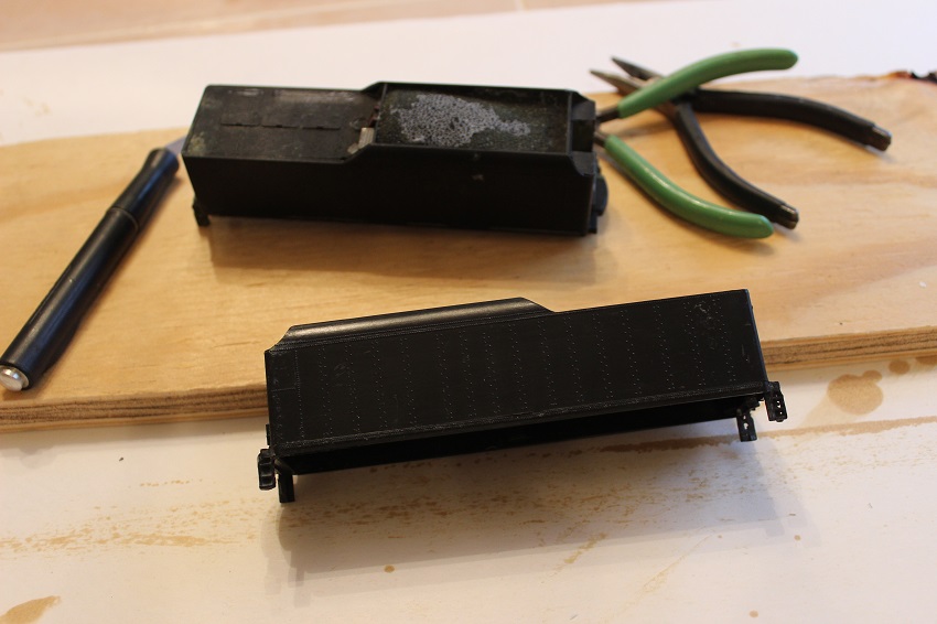 Cutting off the moulded on truck side frames, in this shape they are only decorative pieces. So they have to be removed from the underbody casting to make them to become real Archbar type trucks.