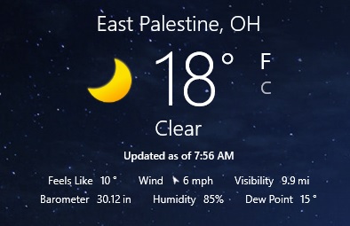 Clear and 14 headed for sunny and 30. Winter storm warning posted for tomorrow and Wednesday. 4-7 inches of snow predicted.