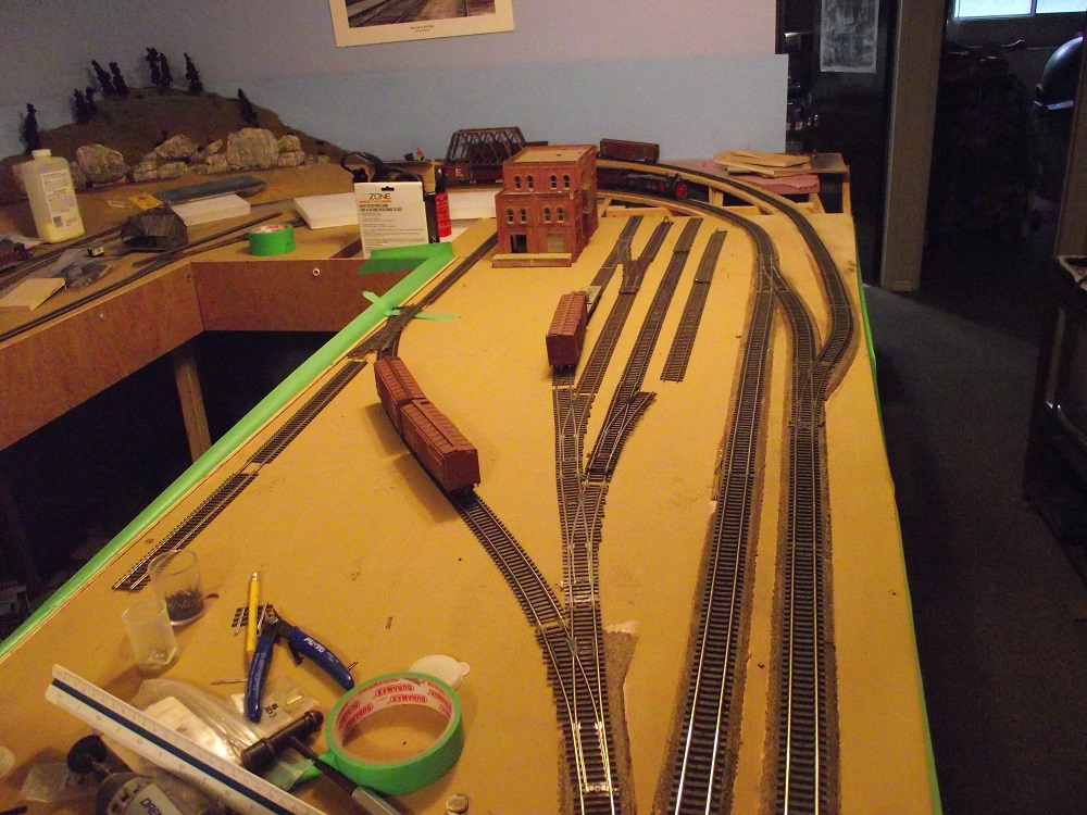 With the turnouts fixed, I tacked them into place, along with the 's' curved flextrack in the picture. In the background you can see the two turnouts for the run-around track in the yard.