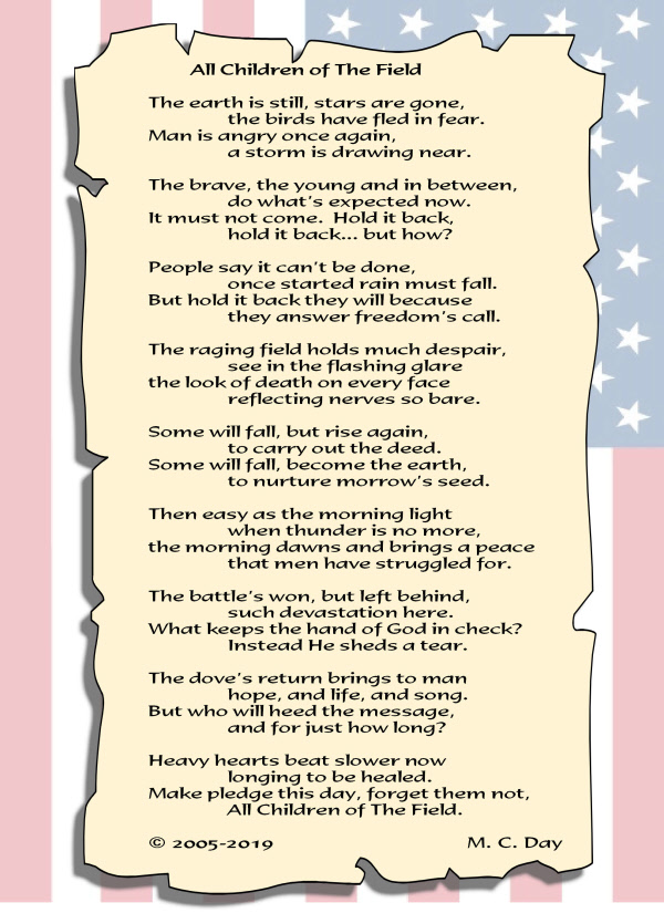 Good morning all, today is Memorial Day for a lot of us, I think that worldwide, we respect this day as a way of remembering those who sacrificed all to maintain the freedom we all enjoy. My wife lost a brother in the Korean war, she wrote a book about her family life and as an introduction, she wrote this poem as a tribute to those who go into battle for the sake of others. I may have posted this in some years past, but it's worth repeating on the day of remembrance.