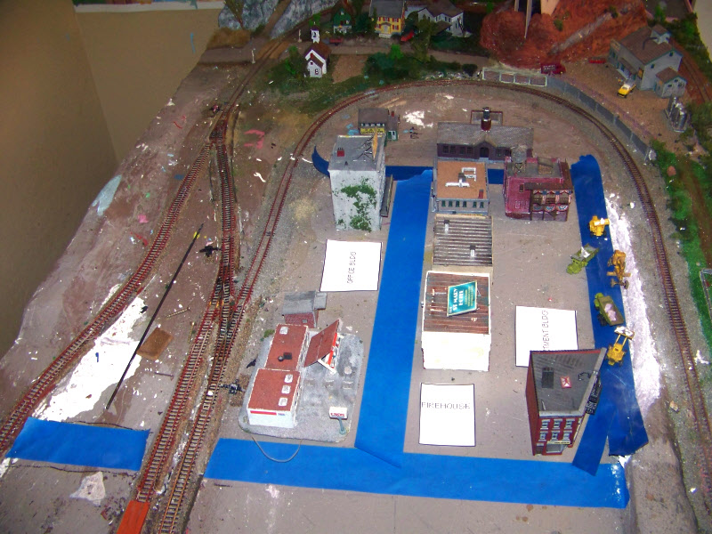 Just trying to figure out what works, and this is what I've come up with... so far... The first photo shows my first thought, one street through town with a few buildings from my first layout and adding a firehouse kit. Looked too strung out, so I got permission from the town and the railroad to dig away some of the foam on the right-of-way to allow the construction of another street. Note that there is a construction crew busy digging away at the foam, working day and night so we can meet the April 30th completion date. I can now add a few more structures, the firehouse, an apartment building and an office building. A few structures still need repairs, and I've already done so with the Museum and a few others. There will be a playground by the school and a park next to the museum. I want to add an underpass and bridge, but that will come later on Got enough to do now as it is.