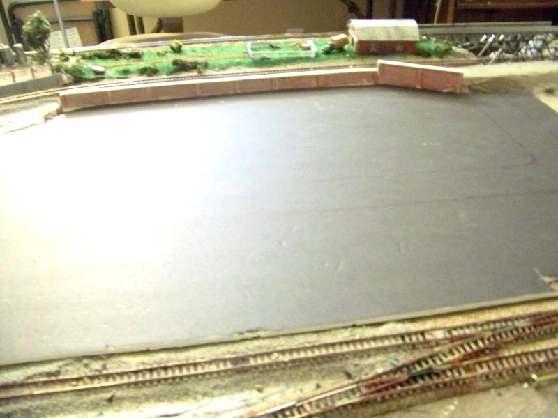 I created a full-size template for the area being worked on making it possible to work off-site to put in the gutters, streets and sidewalks. Once that's done, I have a helicopter crew on standby to place the template where it needs to be moved from the workbench to the layout.