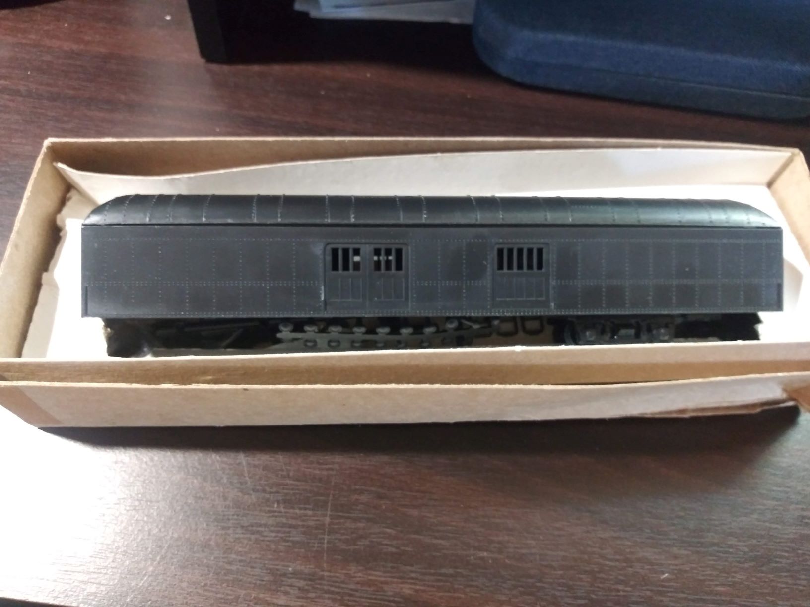 Well, here is the car. Bought used off EBAY for a decent price. The kit is missing a truck screw and a coupler box screw. Neither will be an issue. I think the tooling for these cars dates to the 1970s - and there are issues. I've learned that these kits have incorrect trucks per prototype. Also, the baggage car shares the same truck spacing with the coach and other cars, and thus has the truck bolsters too far from the ends because the baggage car does not have vestibules. I am fine not correcting those issues, as I have far too many other things to do besides cutting and gluing.