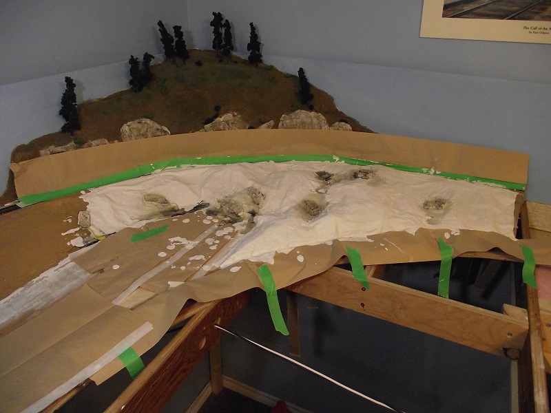 I added the hardshell, a few rock castings and colored the rock castings. This time around I was a bit more diligent with the masking tape to protect my trackwork and already finished scenery.