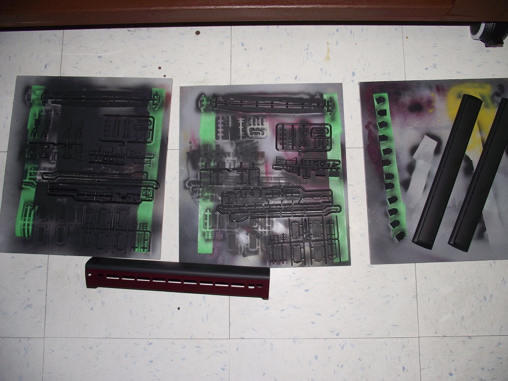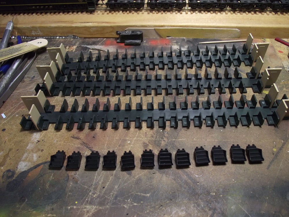 I painted the remaining parts on their sprues. Most of them are underframe parts and I'll touch up anything later when I weather the cars. I used Polly-s steam power black. I also painted a the roofs, a lightweight car body of unknown origin, and a few other projects. It's less wasteful to airbrush everything in one lot.