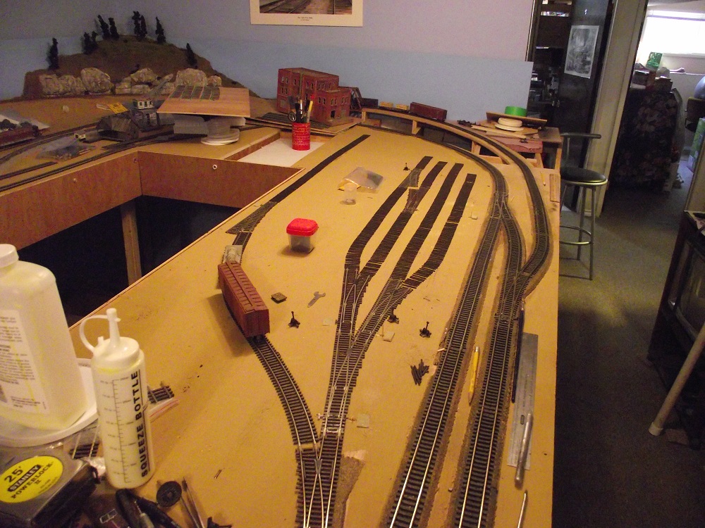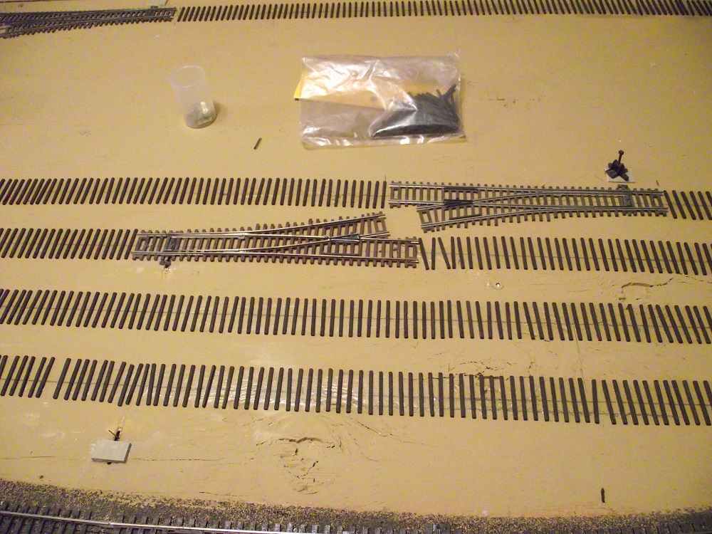 I like the look of hand-laying in the yard and sidings where not all the ties are perfectly aligned and straight, just like the real thing. My plan is to connect the short space between the two turnouts first, then sand the ties lightly to level and weather them a bit.