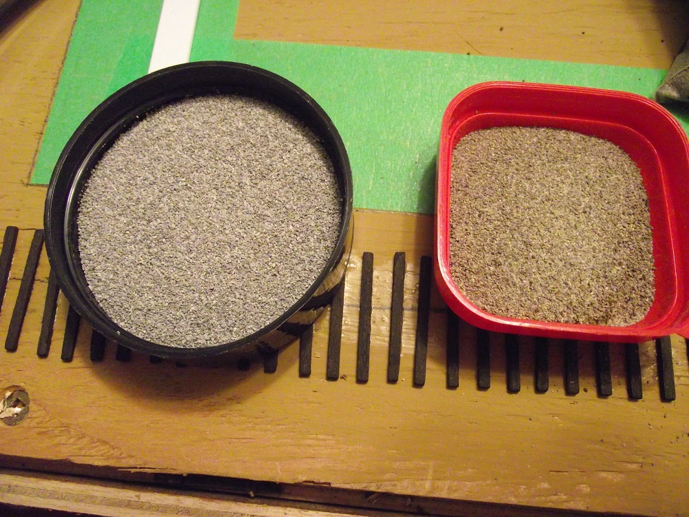 On the right is Woodland Scenics Gray blend ballast, on the left is their gray. I'm using the gray blend on my mainline and passing sidings. I think I'll go with the gray, which is slightly darker, for the yards and sidings. I have already ballasted part of my stamp mill/ logging spur with the brown ballast but I figure that will be okay as that was probably built at a different time with rock from either leftover mining debris or a different quarry on that spur.