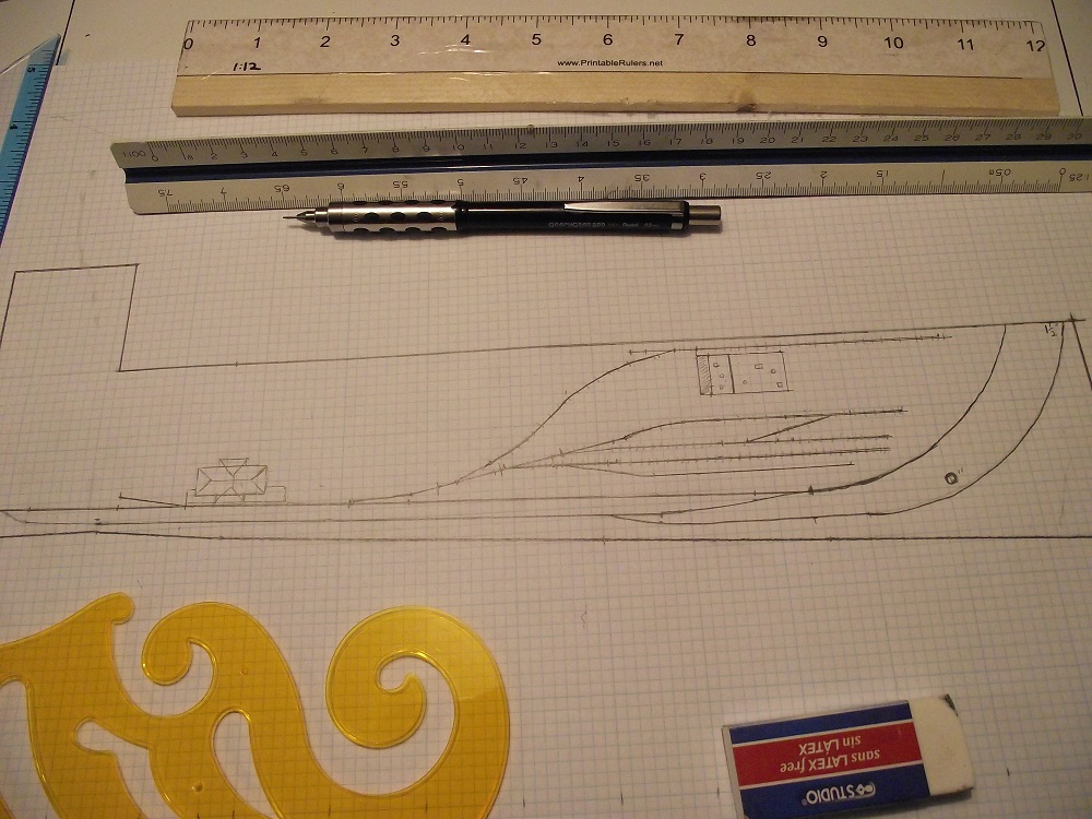 The scale is 1" to 1'. I went online to Printable rulers.net and found an imperial ruler that was divided into 1/12th on an inch and that helped with scaling down the layout. After that all I needed was a straight edge, a square, compass and a French curve. I added the warehouse and station buildings since I already knew where they were going.