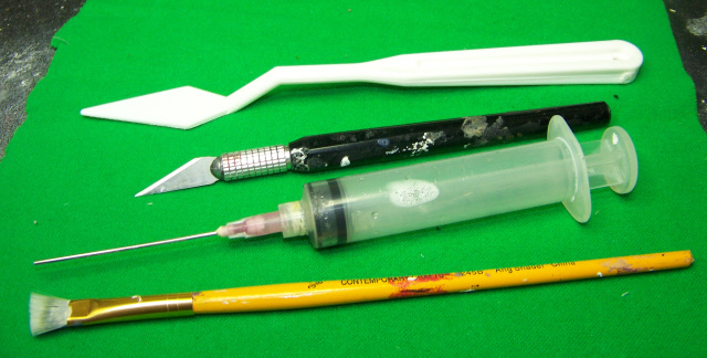 I used joint compound for the chinking, that gave me a few hours of working time before it set. Here's also a shot of the tools I used for the chinking.