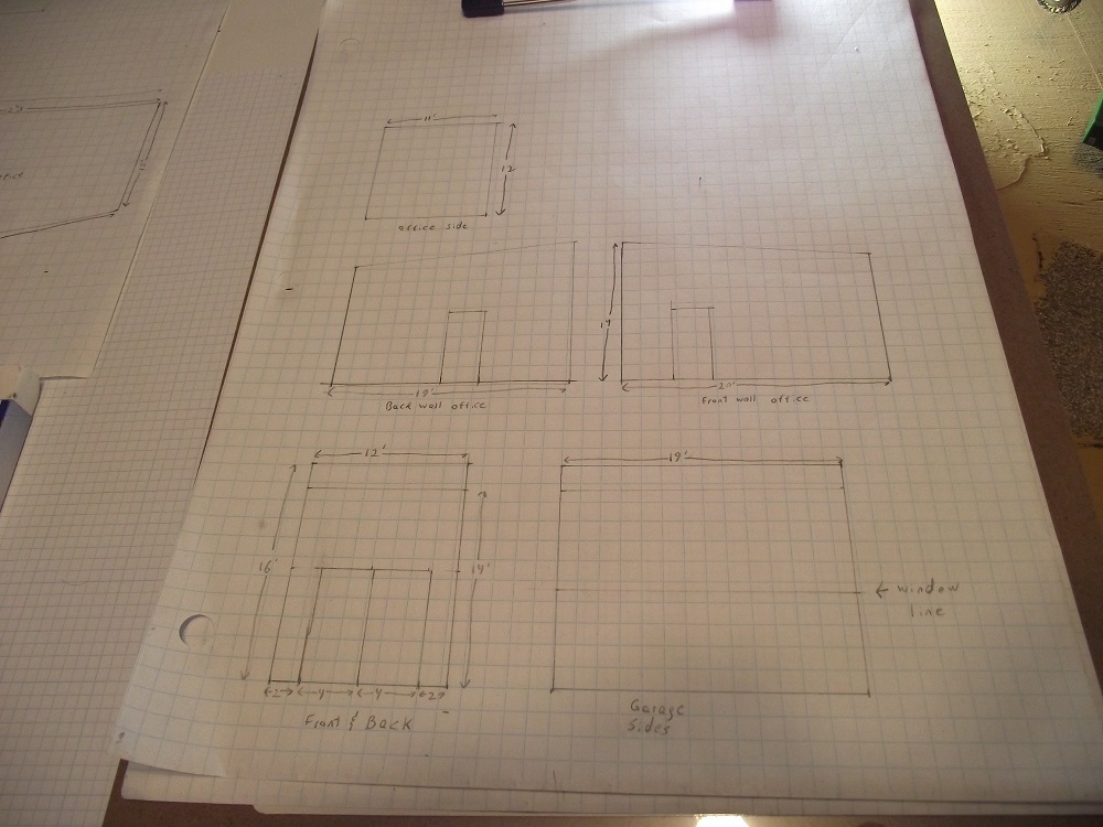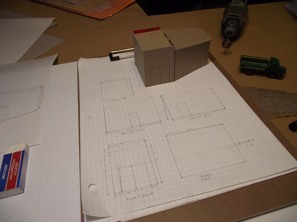 It's inspired by Bar Mills 'Bulls Salvage' I like the bar mills structure except that it has a strange wrap-around addition on the side/back that doesn't make sense to me. I also would perfer the have garage doors in both the front and back of the garage. I spent a bit of time studying pictures of a few built-up Bulls before drawing the plans for mine. I originally made the garage larger but shrank it back down again.