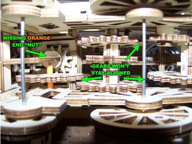 A few more issues, those little orange plastic donuts are suppose to act as lock nuts, but they continually pop off. Gotta use a bit of, yup. glue to keep them in place. And I have to do something to keep that main gear shaft from moving, you can see when it can shift side-to-side and the gears won't align. This time I can't use glue because the shaft has to rotate.