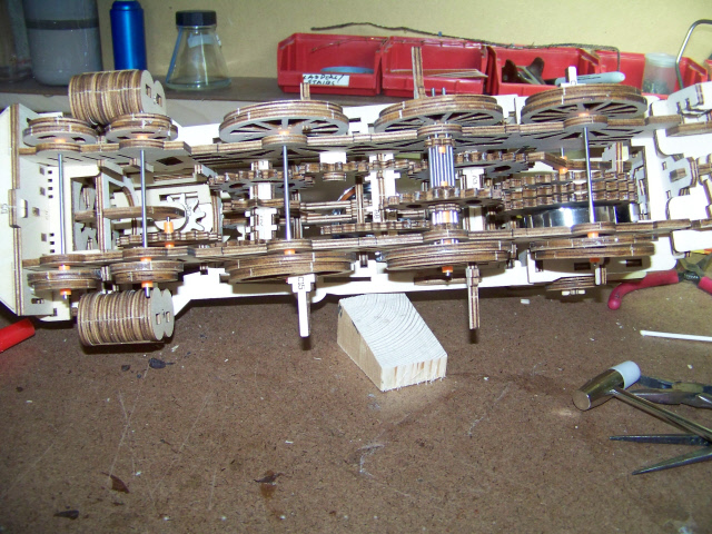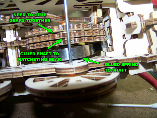 Well, I'm back on schedule, step 41 is now complete. I did get the drive gear issue resolved. there is a ratchet gear inside that group of three gears and the winding shaft wasn't secure to it. Had to use, you guessed it, glue to get it to hold. I seem to need more glue to keep those three gears locked in, just that I have to be careful since that ratchet gear has to be free to rotate on it's own.