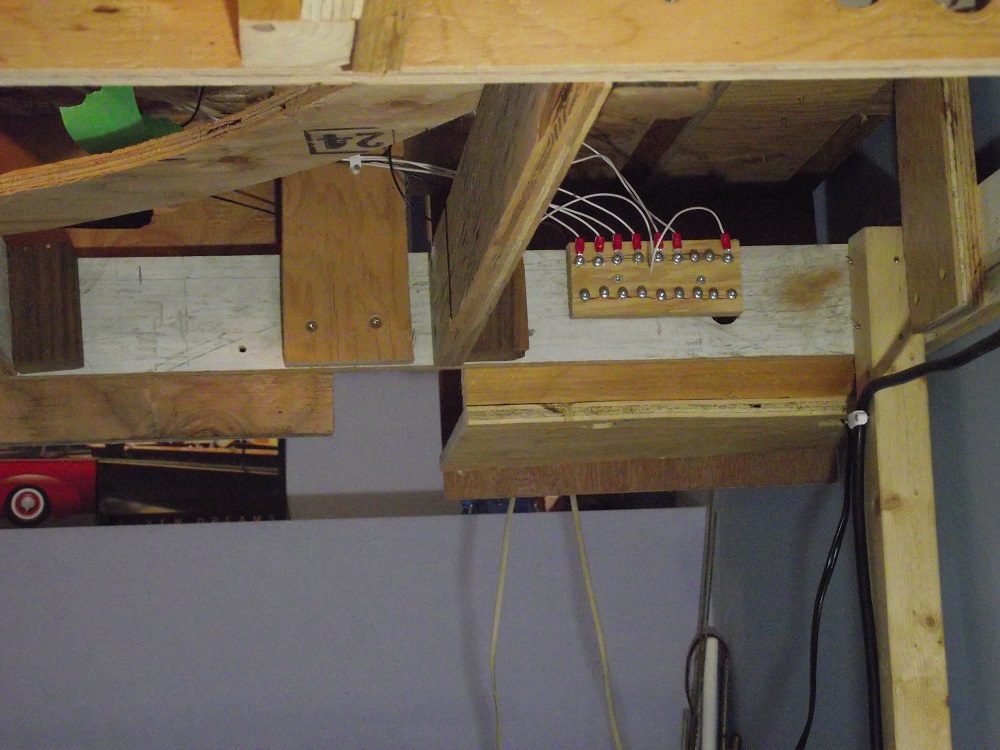 The common return wired were also replaced and routed through another home-made terminal block. The tricky part of this operation is that the narrow gauge is just overhead of the standard gauge mainline (the curved piece of roadbed) I had a hard time routing the wire in a way that it won't drop down and interfere with the track below. That and asking a 6'9" body the work in a confined space is rather difficult.