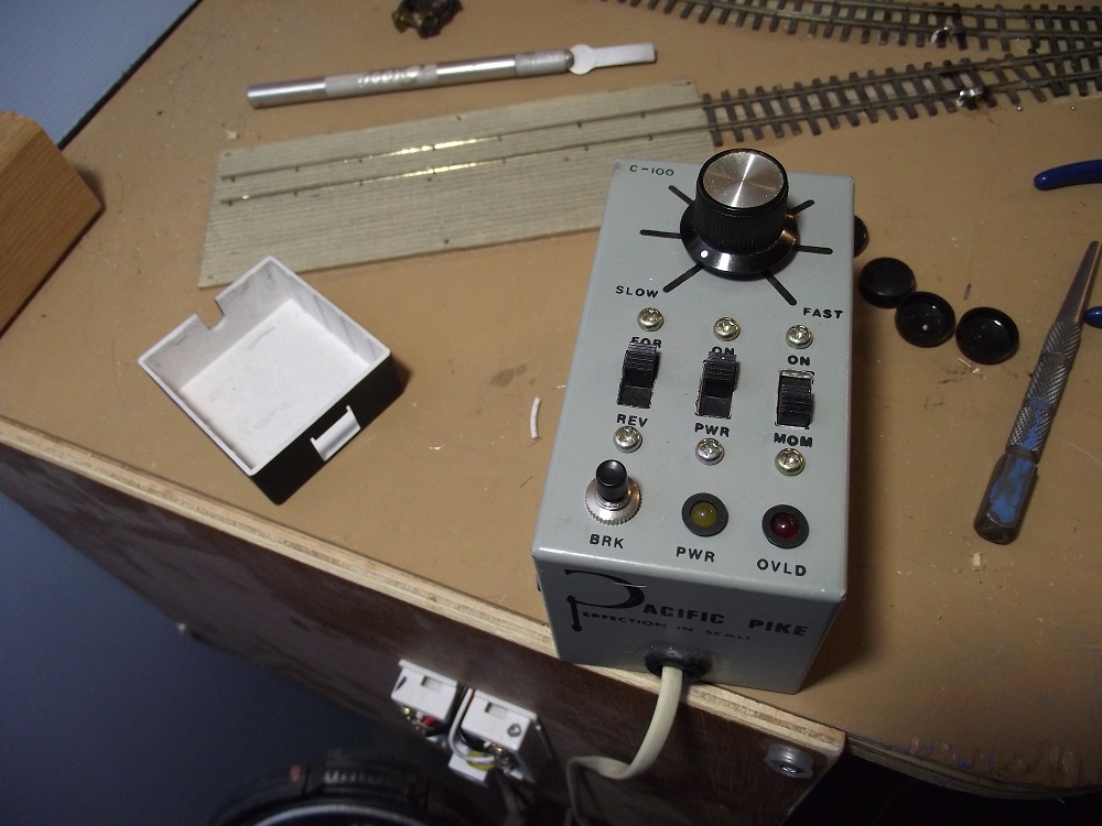 With that done I added the transformer and walk-around throttle. The transformer is an old Athearn Road-race unit. I has a standard 12 volt output and a 'drag-race' output of 16 volts, with a flip of a switch. I'll probably tape over the switch so there won't be any accidental locomotive drag races!