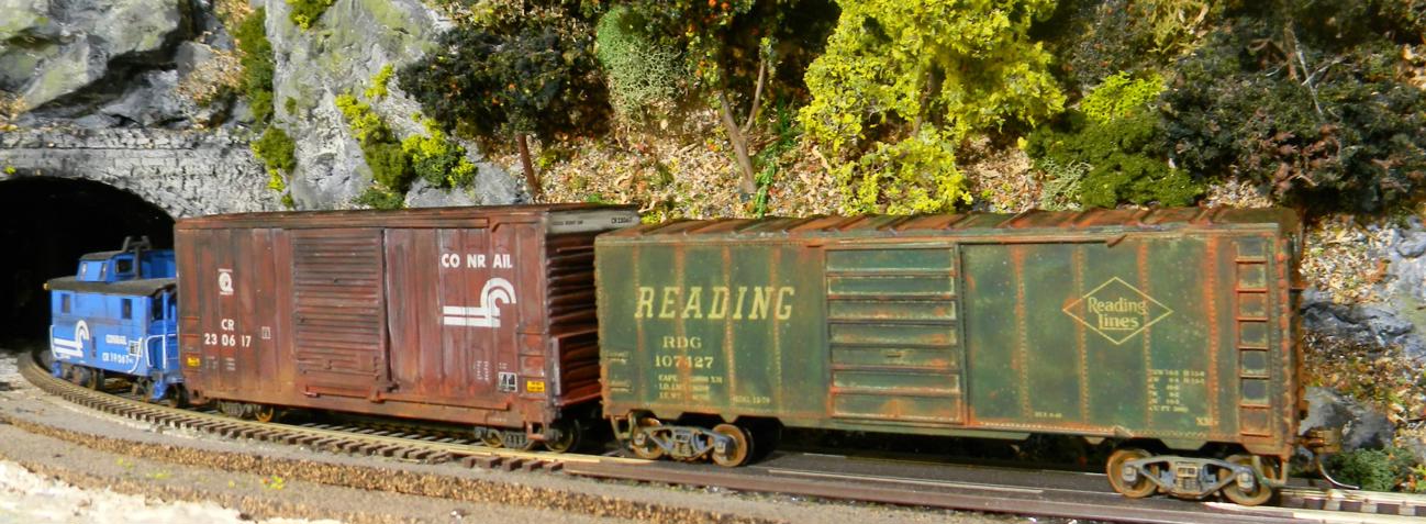 Gave the two 40' boxcars weathering treatments after dusting off the X-21. The Conrail high cube got a dose of black wash and then I pulled the wash off of the Conrail decals, while the Reading AAR got a black wash followed by good dose of rust on all of the rivets as well as a full-on rust and grime treatment on the roof and then some road spray on the lower sections. Certainly aren't the boxcars they were yesterday!