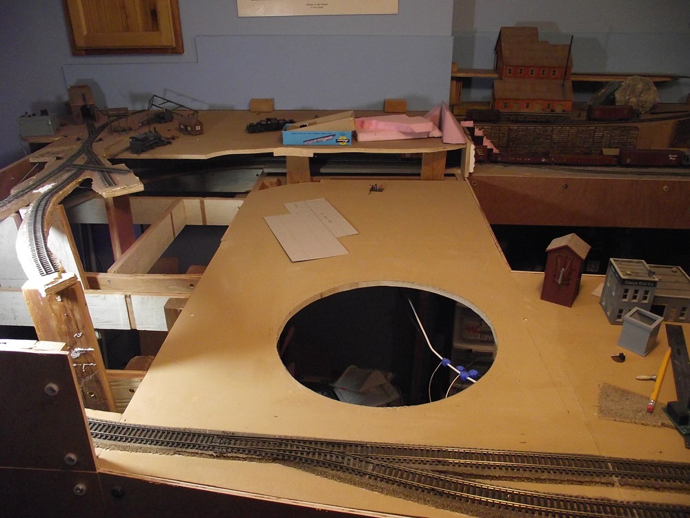 Instead of using the adapter that I made, I decided to simply cut a round hole in the layout for the round pit to fit into. I used the adapter plate to mark the hole in the layout's plywood,
