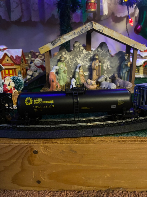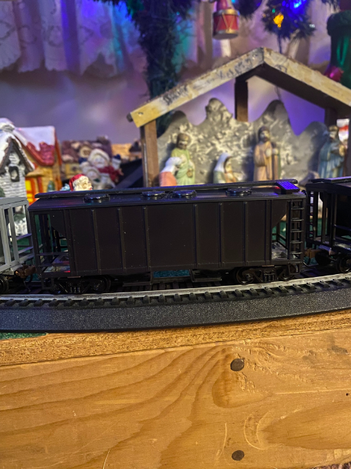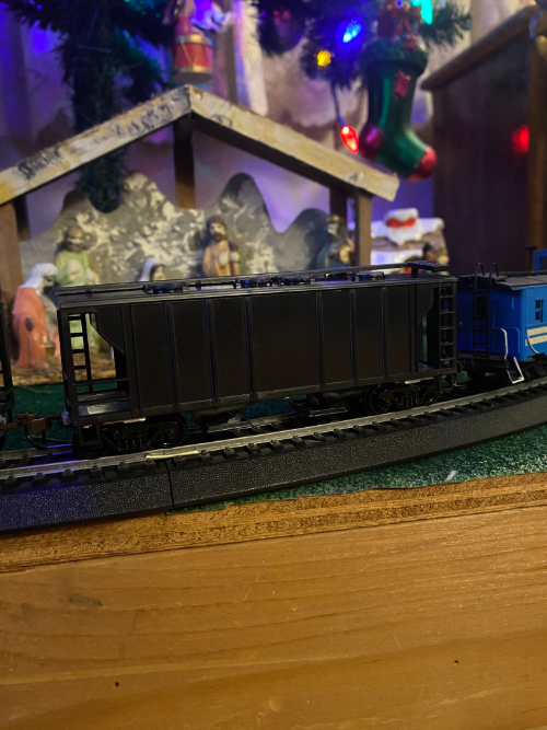 Yesterday I received a package in the mail from Bruce. Again thank you very much. It contained 3 freight cars, 2 covered hoppers and 1 tank car. I quickly made work and started on the tank car yesterday. The details on the tank car are amazing and it runs smoothly with the other freight cars. After getting the tank car together I moved onto the two covered hoppers. Yes they both have the metal frames and required some sanding to get the burrs off of them. After taking care of that, I got them together for right now that way I can test them along with the tank car under the Christmas tree. Once Christmas is over, I will move on to getting the covered hoppers painted, numbered and decals on them. Below are pictures I took of the freight cars in the mixed freight consist.