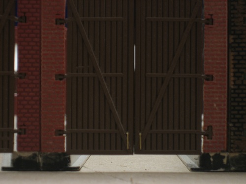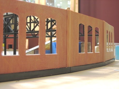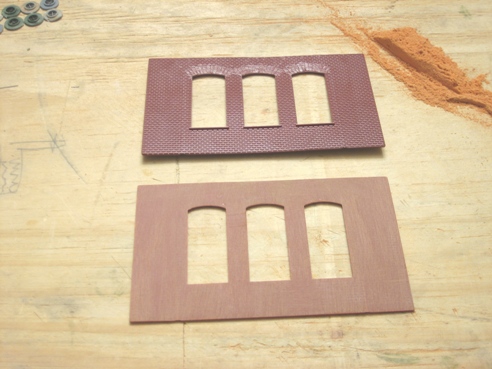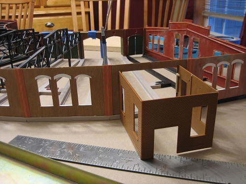 I have cut and installed new window sills on the rear wall. The brick columns are from some old styrene sheets that I had, they hide the seams nicely. I will also add a strip of styrene over the windows, I don't know what this detail is called but I've seen it on many brick and concrete buildings.