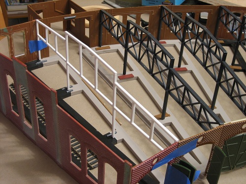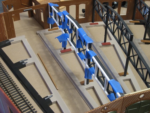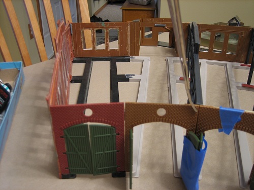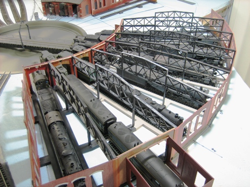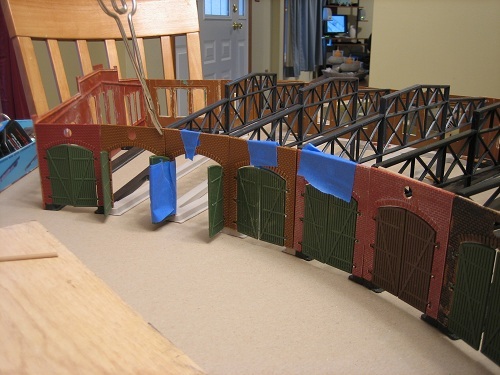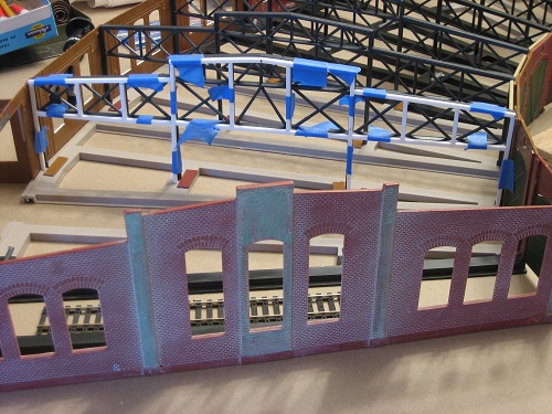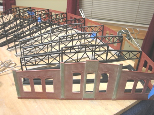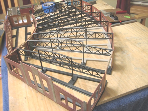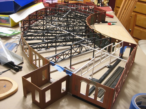 Now that the spring challenge is over and my parts have come in from trucklover,(thanks josh) I can resume work on the round house. The new stalls bring the grand total to 12. I've added the same bracing as before and a 2nd extension. One of the used kits were missing the internal trusses. I'll have to make one, that might be the next job to tackle.