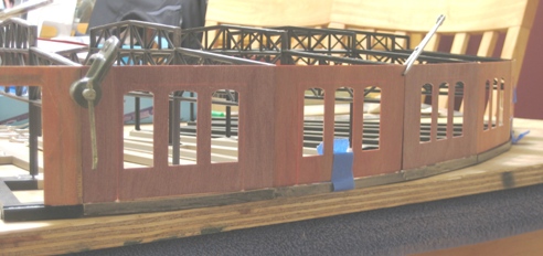 I used some 1/8 inch square tubing to replace the missing truss work. I used the existing truss as a guide. well I didn't need to make an exact replacement, just one that was the same dimensions as the others, they really wont be visible on the finished model. I cut the tubing to the fit and taped it on to one of the old trusses, then tacked the side away from the truss with some gap filling CA. To make the bend in the upper most roof support I heated the stock with a hair dryer and bent it to the same angle.