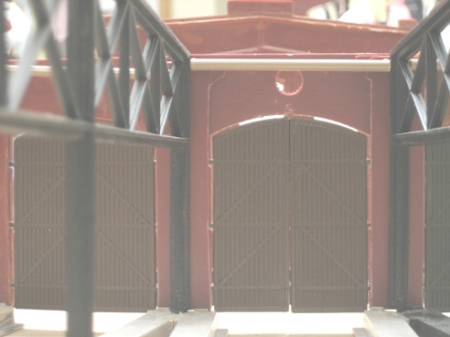 I also installed the front walls, adding some bracing, cut from old sprues. This gives it some added strength. Here's an over view of the roundhouse as it is now, I still need to pick up the last 3 stalls.