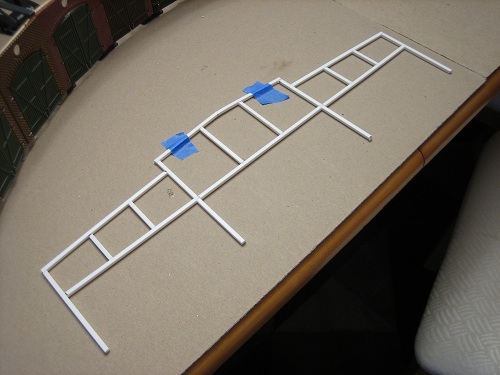 My next concern was that I would have to move the round house around a lot during the painting phase of the build, Back and forth to the garage and down to the basement when it finished. So, I used some more of the same tubing as stiffeners between the trusses, gluing it together with some CA at each joint..