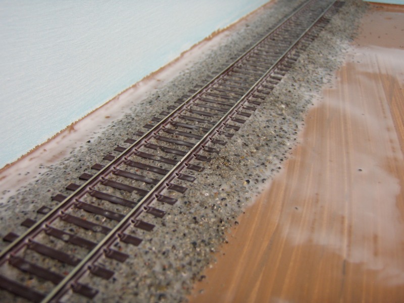 Reinhard....What I do is brush white glue on the "ground", then spread the gravel/dirt over it with a sifter. Once I got the "look" I want, I spray "wet" water over it to allow the gravel/dirt to soak up the glue underneath. After several hours, I'll go over the area with a spray of very diluted white glue. The ballast will go over the ground...just like in the "real" world. Works like a charm.... Goldth