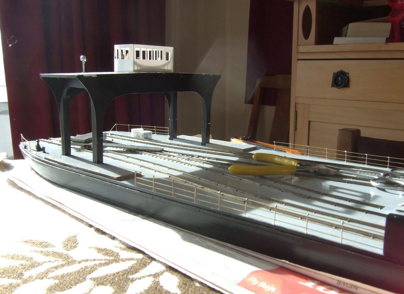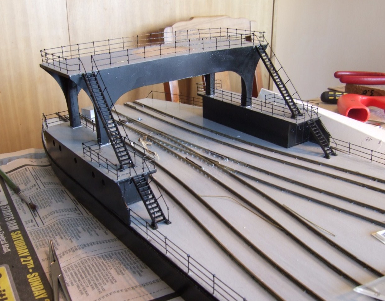 I struggled for a while on how to set up the stairs from the deck to the bridge, then how to make the parts, and then work out the correct and logical assembly procedure while making sure that I had not forgotten anything. Apart from the actual railings up to, and around the bridge I’ve had a successful trial fit  (famous last words???? I hope not!!) Apart from painting I have finished the deck railing.
