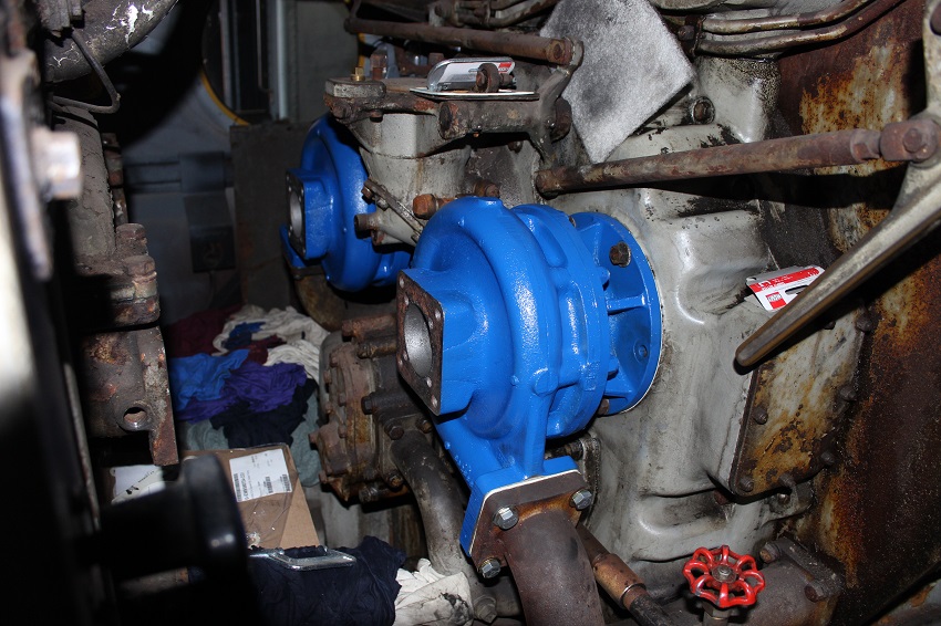 Here they are installed and gasketed up. One more flexible pipe needs to be run from the pump to the expansion tank right behind them, but we need to get those still. And yes, we are one bolt short, that will have to be taken care of before we torque that one down.