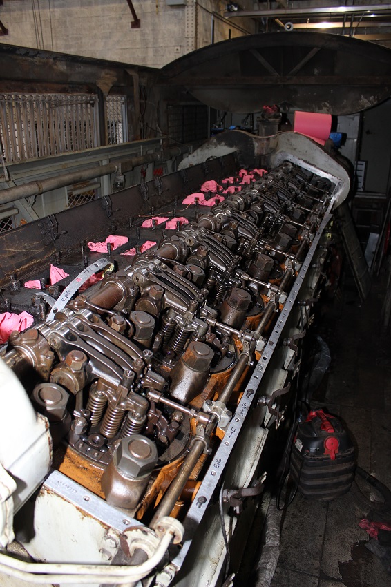 All the bolts were removed that hold down the 567's engine covers in place. This side was lifted off and placed on the floor upside down.