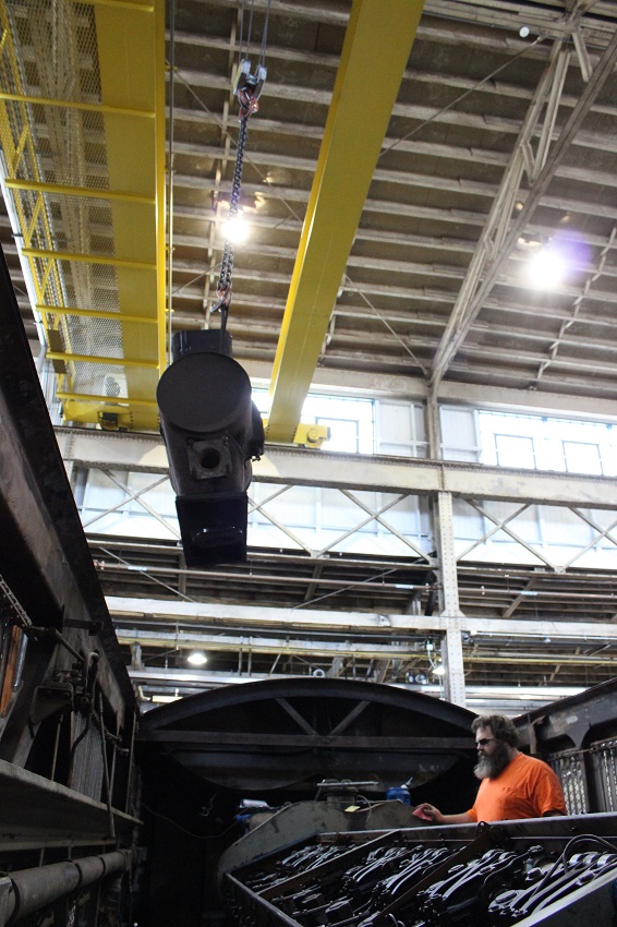 Then it was over to the SW-1 to wrestle the rear section of the hood off. After lots of grinding, cutting, and swearing we gave it our first attempt at lifting the stack section of the hood off. It just wouldn't come off. Metal creaked and moaned, the locomotives weight was lifted off the truck springs, sledge hammers were swung. but still nothing. It held fast to the rear section of the hood. We then repositioned the straps and just lifted the rear hood to try to break it free from underneath as seen here in this pic,,,,but still nothing.