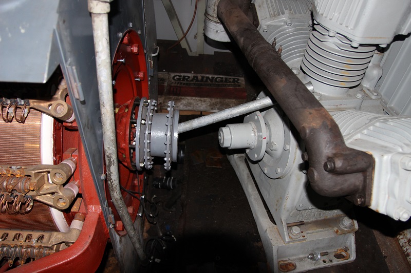 Next we turned our attention to 663, she has been out of service for some time now. After the air compressor and main generator were replaced it was found to have a bad coupling between the generator and compressor. We separated the two so the Steamtown crew could remove the coupling shown here still attached to the generator. That heavy bar was placed in the coupling to support the armature , it only has a bearing on the far end, the compressor is what holds up this side.