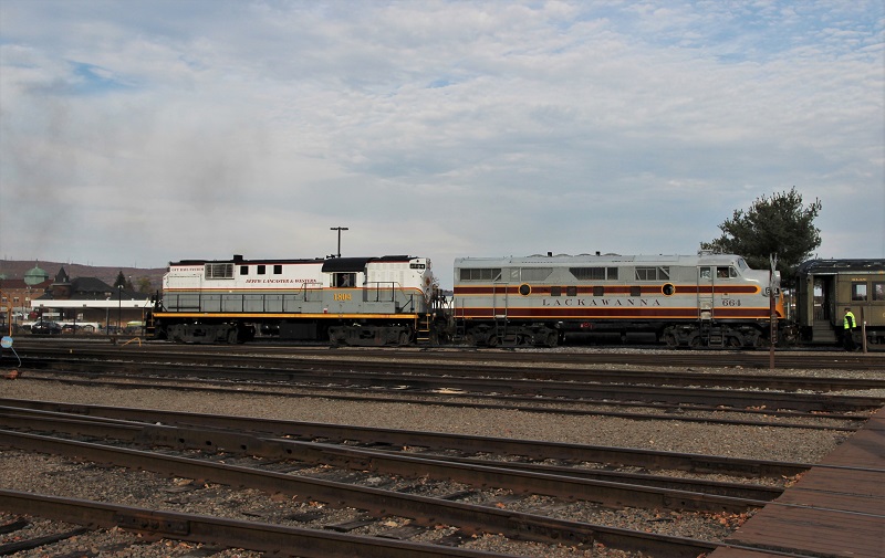 Here we are putting the train together.. The consists was supposed to be one of the DL's ex-D&H Rs-3's and Our F-3 on the point to Carbondale with only 2 or 3 cars, That all changed when the Rs-3's brake system was found to be incompatible with the f's. Also, the train was lengthened to a total of 7 cars. So DL 405 an Alco C-420 was swapped out in it's place.