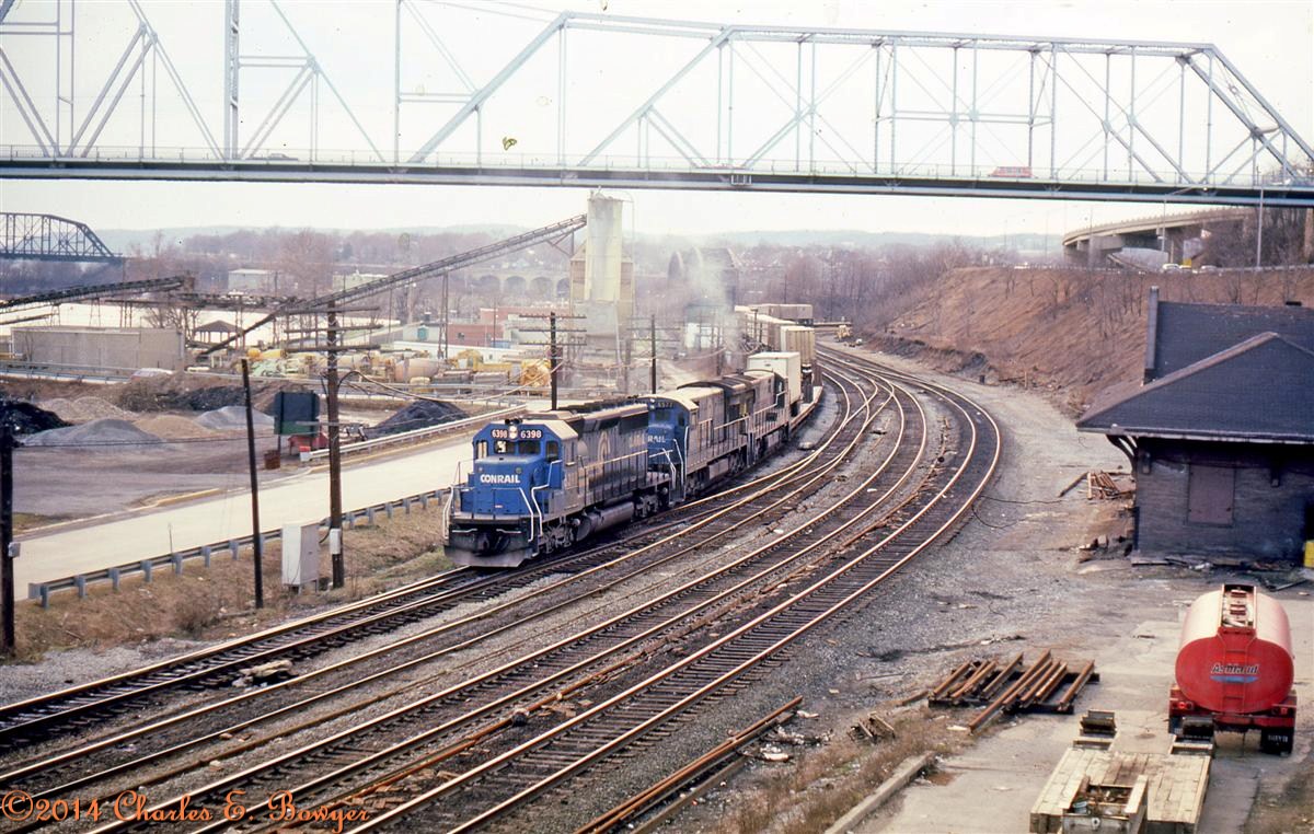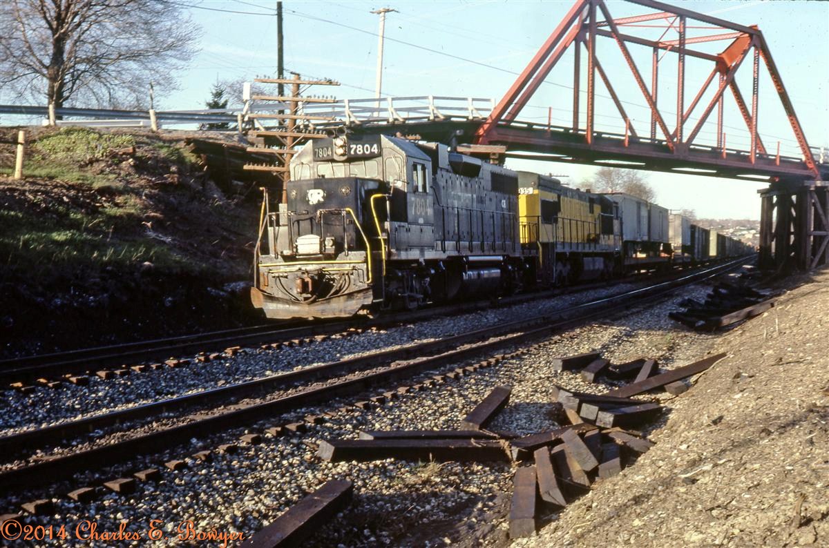 Late afternoon and this westbound is under the bridge at Neeld Road, just west of East Palestine 37 years ago.     Charlie