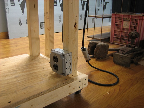 I gave the glue a chance to dry and installed a receptacle on the wheel out section. I'm not sure how I'm going to power the lifting section of the bridge yet. The 110 volt outlet will allow me a bunch of options. It's feed with a section of SO cord with a twist lock disconnect that will give me a safe way to remove the section with out turning off the power.I also made it long enough that I can move it around a little without unplugging it. The track power will be feed from a similar setup.
