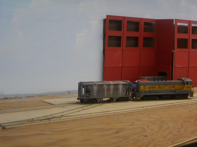 Road loco has pulled up clear of turnout to industrial area. The paper taped to the wall is (was) a drawing of the station that might get built there someday.