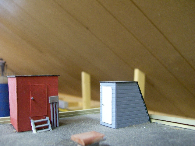 Mine are all of simple sheet styrene construction - the angle-sided ones are a good place to use up all the triangular scraps generated when cutting gable ends for other structures. Board and batten siding can be used as-is, while clapboard can be applied either on an angle to match that of the sloped roof, or reversed, with the plain side out. For your headquarters building, the stairwells could be finished in any material, but elevator head-houses could also be concrete.