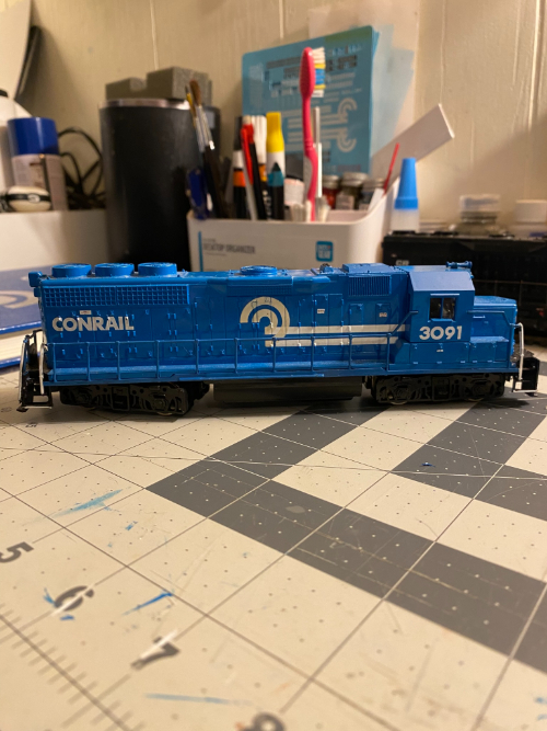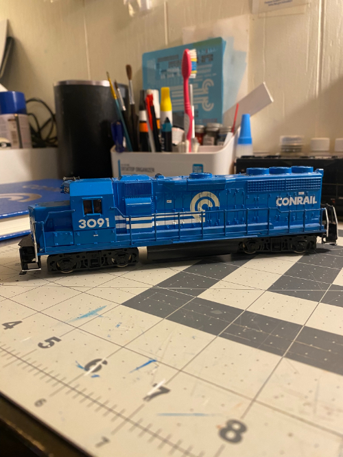 The GP40 is nearing completion. I added a horn, painted the handrails blue, got the snowplow ordered that goes on the front. I have seen photo's of it with the snowplow on the front but never seen a rear shot of it. I also need to get the front grab irons or find the ones that I took off. If I remember where I put them.