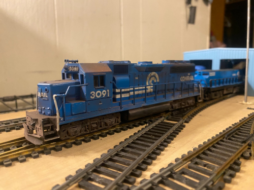 Conrail GP #3091 & MT-4 Slug #1003 at the shops waiting for 3091 to have the marker lights fix and a new front knuckle as the crew pulled a knuckle while moving cars around. If you look right above the slug, you can see #9950 sitting at the shops.