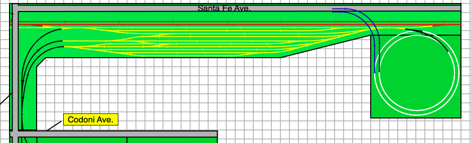 The upper level with the yard is now part of a layout section, and no modules will be part of this yard. Now i realize that there is virtually no room coming off the BNSF mainline tracks on either side of the plan, but this is of no concern to me. Basically the BNSF mainline will just be for show, and simulate the real mainline running by the yard. And remember, all track spacing is 2" track centers, and on the helix, there is roughly 3" between tracks. All switches are #8's or #9's and minimum radius in the yard is 22"