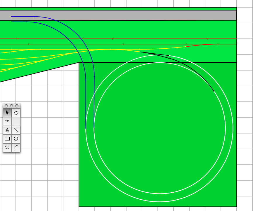 These 2 pics show the helix and the yard. The Black tracks on the right side of the plan are the tracks that are on the upper level with the yard. The white tracks are the helix traveling down to the lower level. 28" radius on the outside track and 25" radius on the inside track. The Blue tracks are the tracks that come off the helix at the bottom at the lower level. Ill have to do another plan to continue the blue tracks on the lower level. Yellow Tracks are the BNSF/M&ET Interchange Yard, and the Red Tracks are the BNSF Mainline.