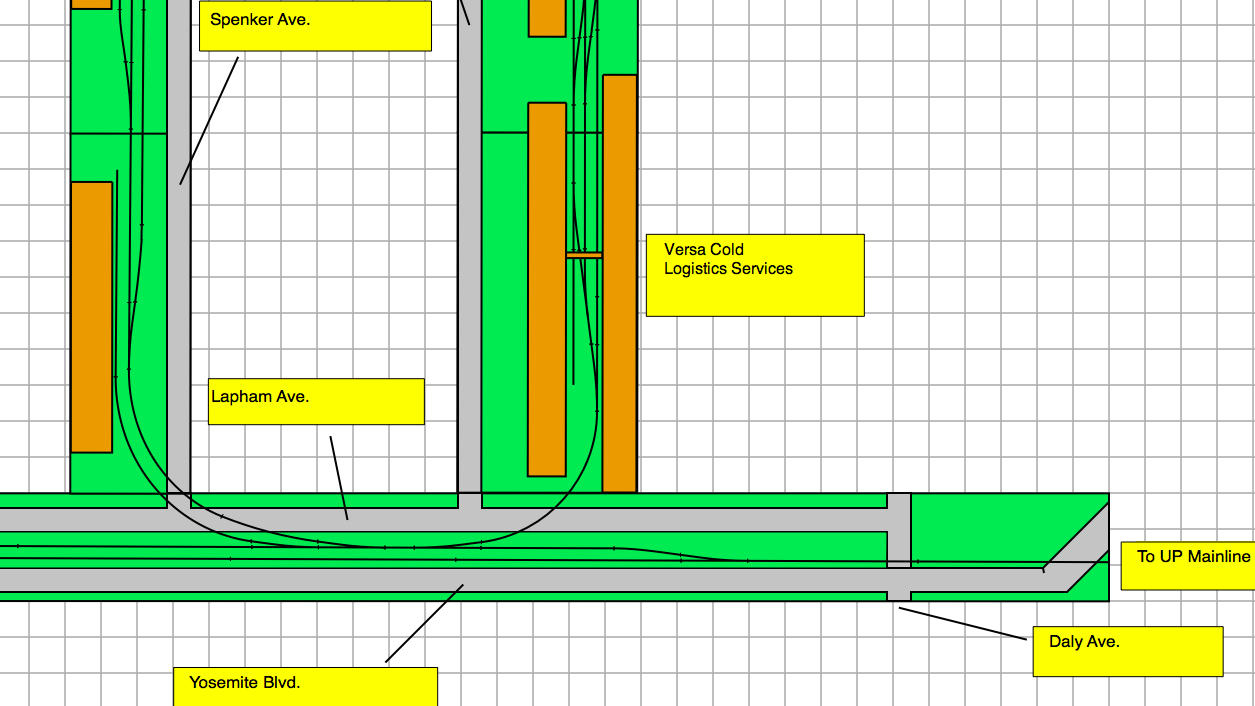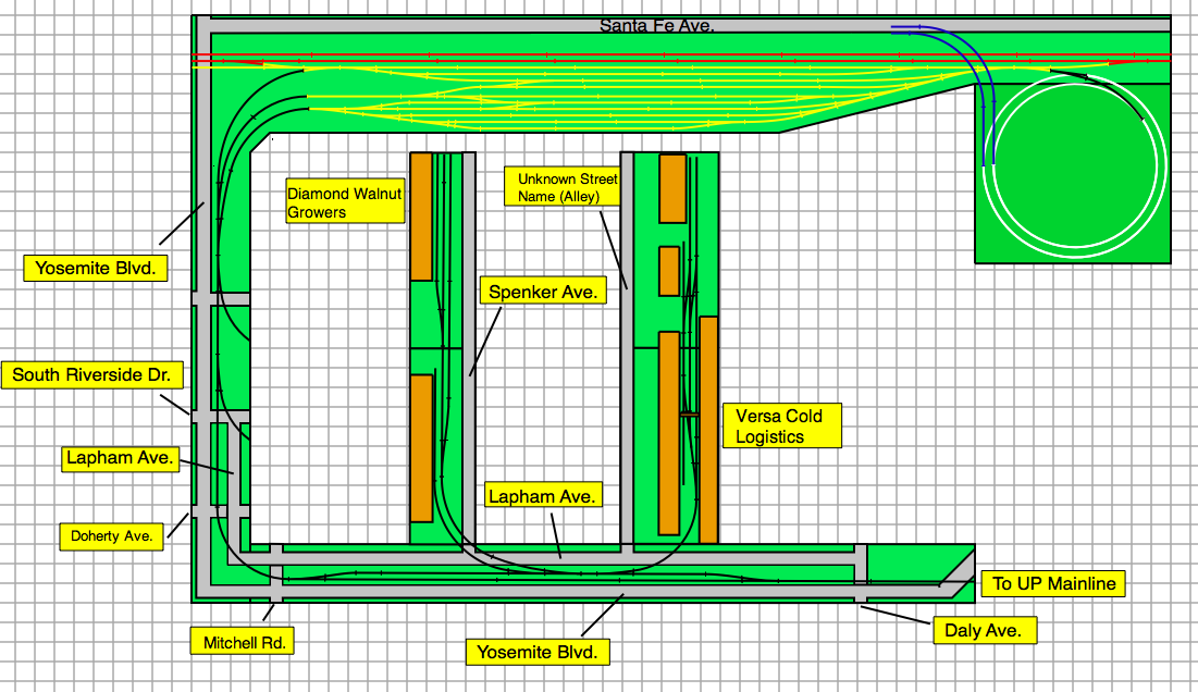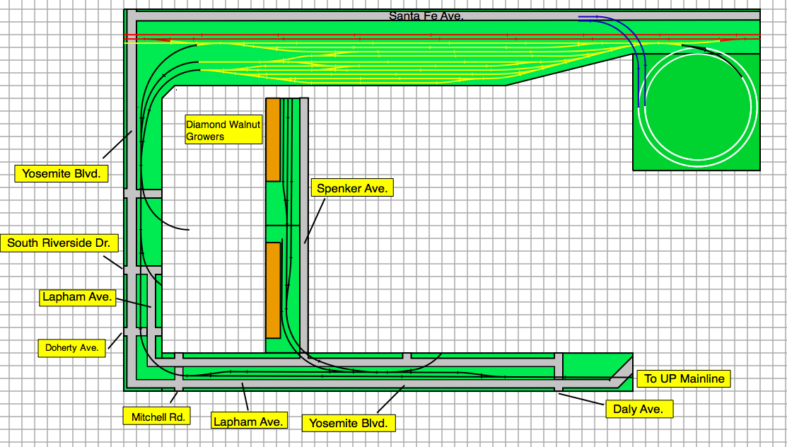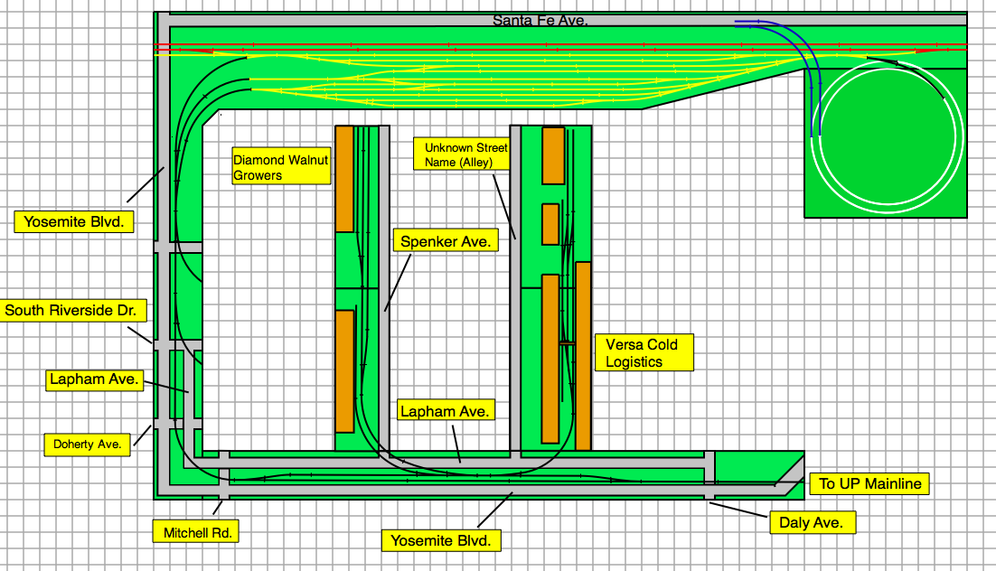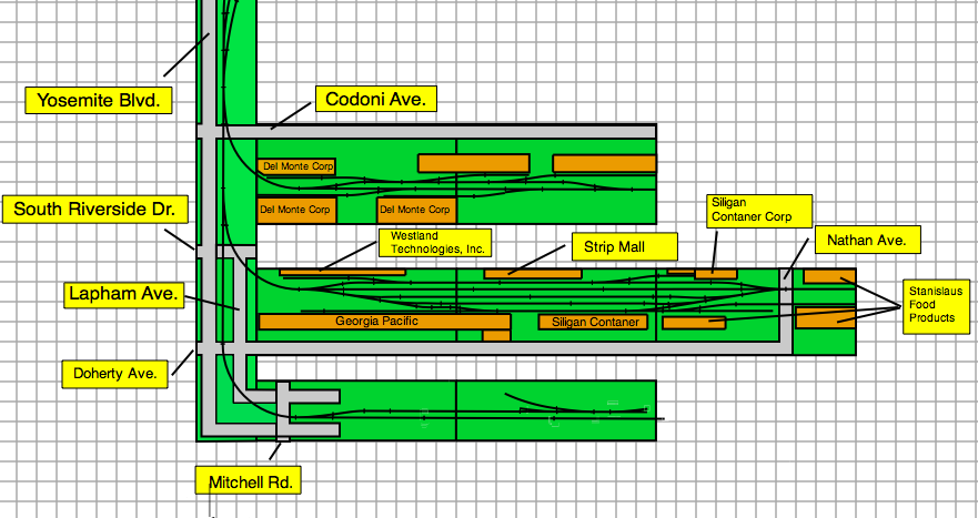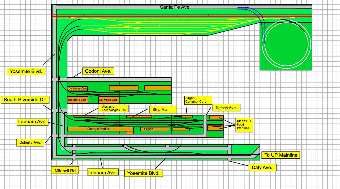 We'll start at the top left of the pic. This is where the 3 tracks come out of the left end of the Interchange Yard. These tracks merge into one track, and parallel Yosemite Blvd. When the tracks come to Codoni Ave. a spur comes off and goes to the right, where the first 2 modules will be located, Codoni Ave. A total of 3 modules (each 6' long, ONLY 2 SHOWN SO FAR). Below Codoni Ave, South Riverside Dr. and then Lapham Ave. parallels Yosemite Blvd while the tracks run down the center of both roads. Just below South Riverside Dr. another island of modules. These are the Doherty Ave. Modules. Just below this, the lower left corner of the layout, Yosemite Blvd and Lapham Ave take a right turn (in the real thing they keep going down straight and do not turn....) and then cross Mitchel Road. Tracks still say in the middle of both Yosemite Blvd and Lapham Ave. A little down the line, a spur comes off. This is currently where im at with the plan right now.