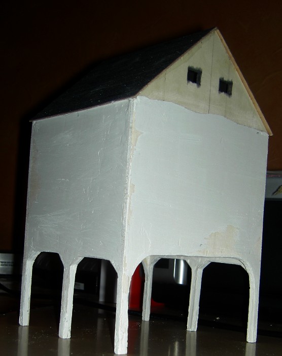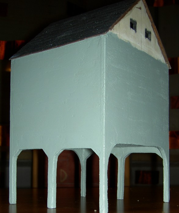 This weekend I have painted the 4 walls and the legs of the coal dock. First I have applied simple grey acrylic paint. Next step was to add the first layer of the simulated concrete. I have mixed the grey acrylic paint with ocher yellow and with finest sand (found on banks of most creeks). After applying and drying of the mixture I have grinded down the walls again and have applied the last layer of acrylic paint, now without added sand.