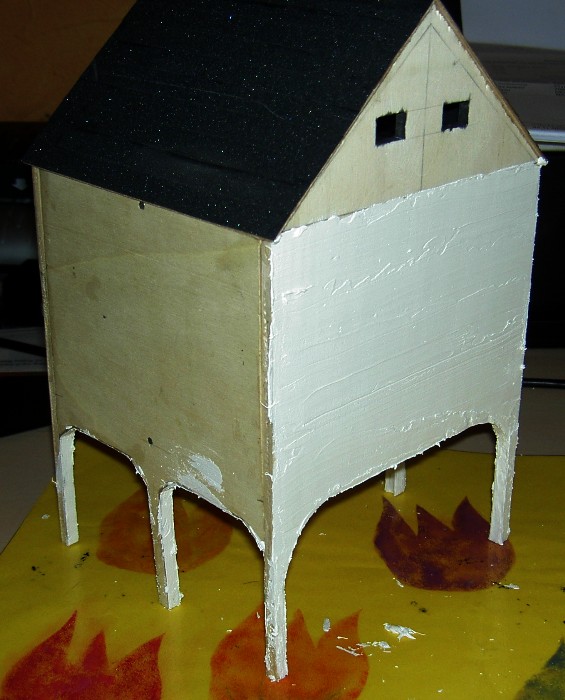The upper section of the pediments will be covered with cutted paper. Later the paper will be colored and weathered to imitate rusty metal sheets.