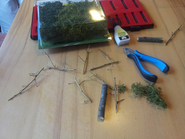 The other materials are HEKI Natural bushes, water based glue (water resistent after drying), an assortement of small drillers and a knife.