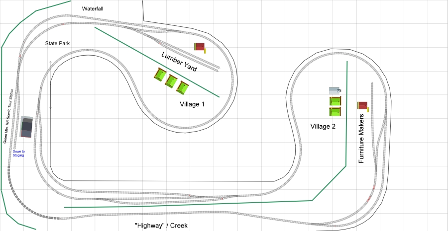 So I've offered a once-around plan, with a hidden lower-level staging yard. You have two towns, the main one with an (non-functional) interchange, the smaller one with a couple of industries. I'm thinking for your industries you're looking at perhaps a marble quarry, something dairy-related, and farm-supply type stuff.