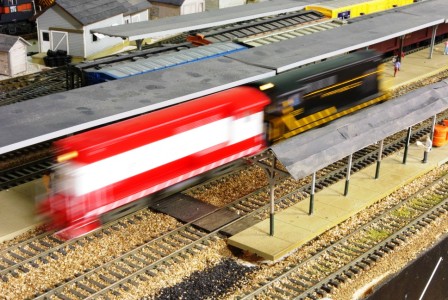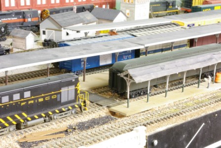 Then they shove onto Track 2. I use Kadee 308 under-the-track uncoupling magnets for situations other than on a main track, where I use their electric magnet. I paint the sides of the rails yellow where the magnets are located so I can see them easily in operation: