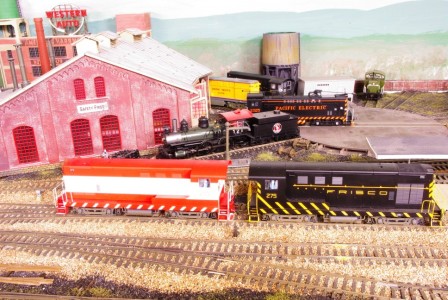 Here are some more photos of the mini-op session resulting from the switchlist I posted. First, the Frisco switchers move out of the passenger escape track pocket on Terminal Track 3: