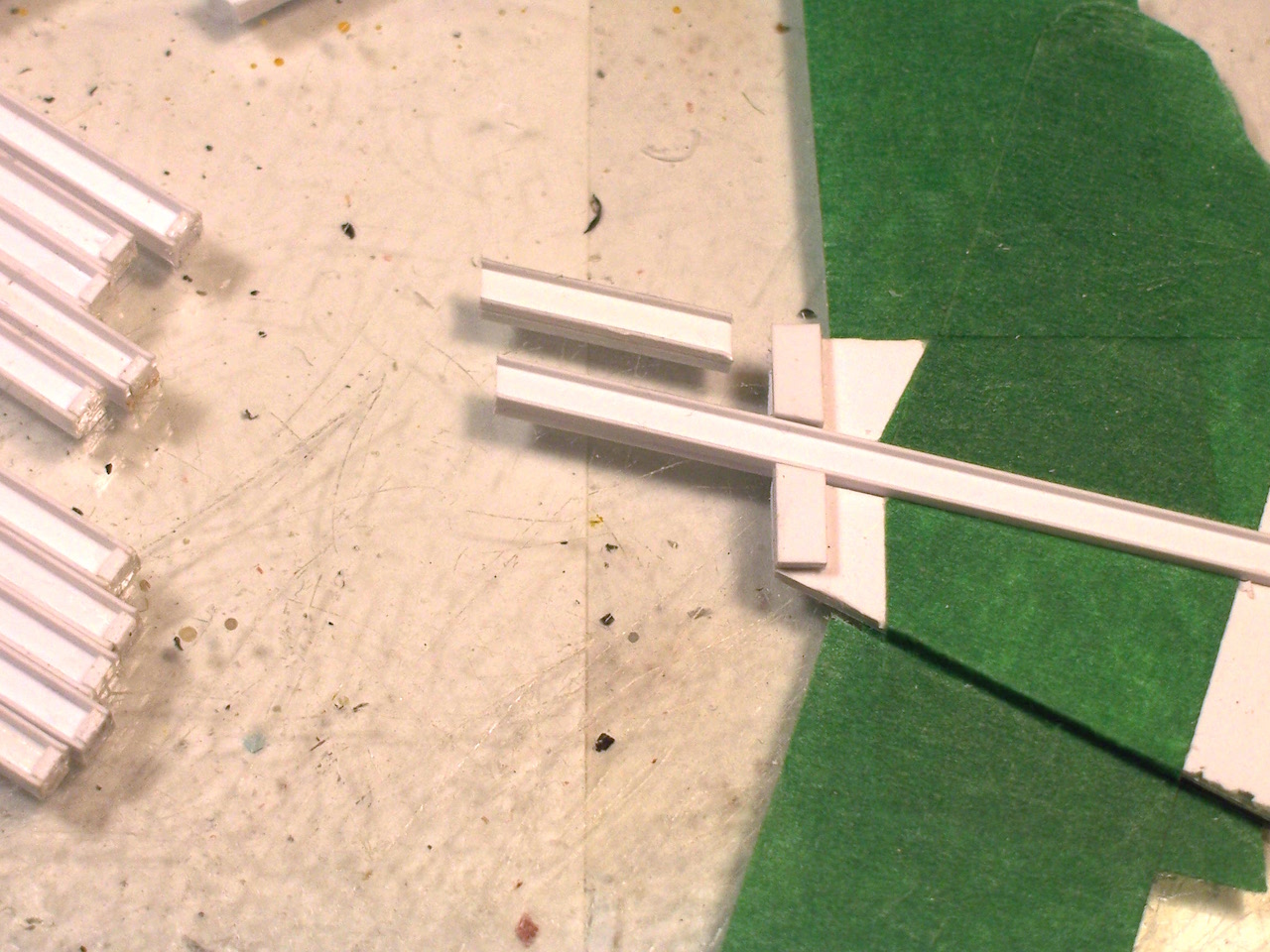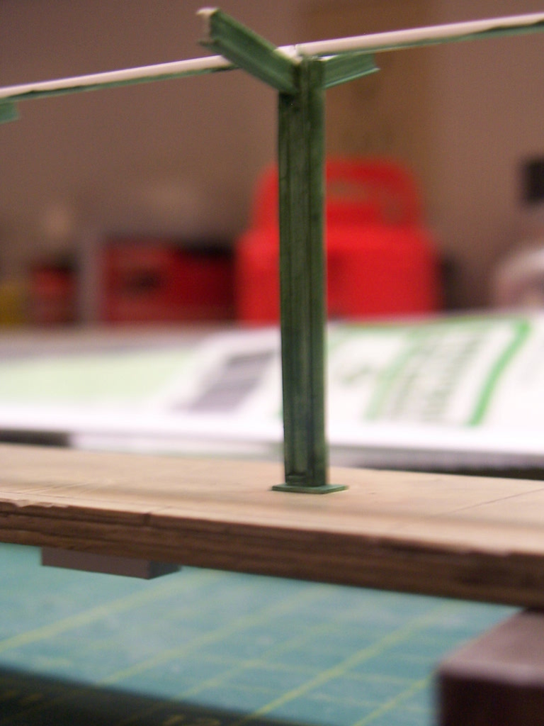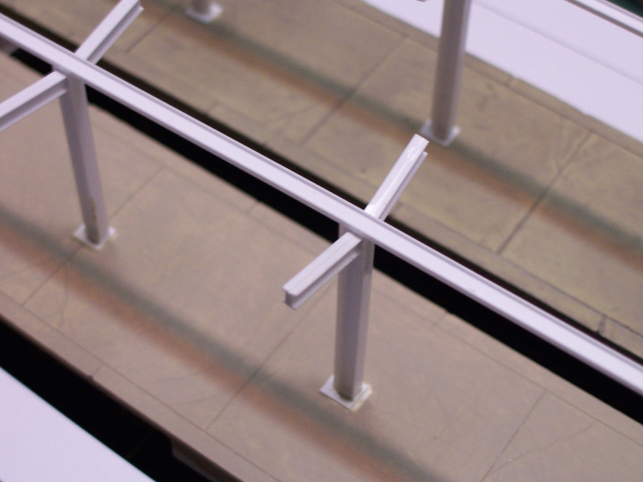 I used Evergreen H-columns for the main vertical supports, and lengths of Evergreen channel stock, cemented together back-to-back, as the actual supports for the roof material.